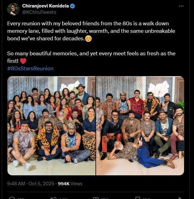 “ప్రతి రీయూనియన్ జ్ఞాపకాల వీధిలో ఒక అందమైన నడకలాఉంటుంది.నవ్వులు, ఆప్యాయత,ప్రేమ – దశాబ్దాలుగా కొనసాగుతున్న ఈ బంధం ఎప్పటికీ మురిపెంగా ఉంటుంది”అని చిరంజీవి భావోద్వేగంగా రాశారు.