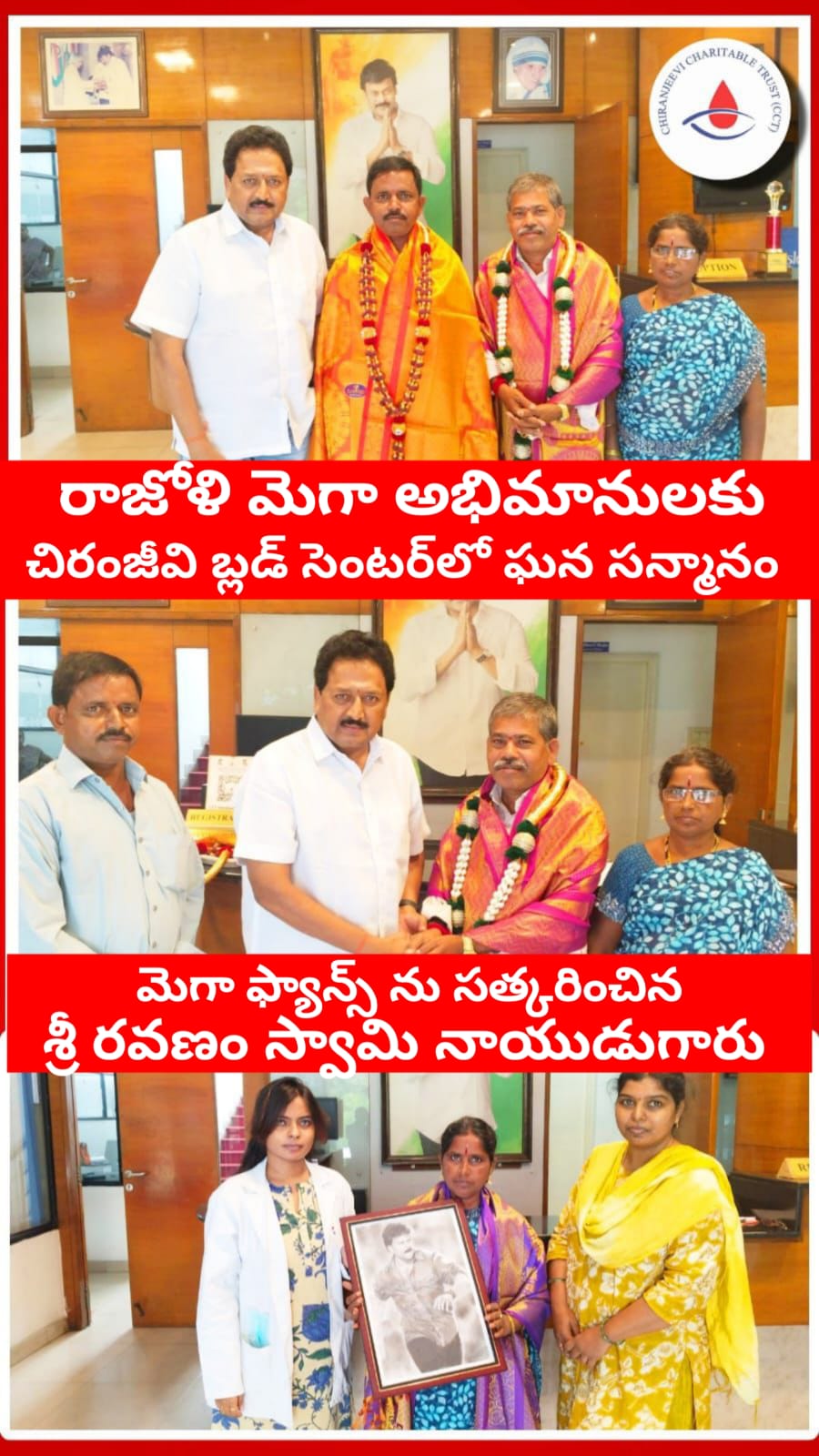 గద్వాల్ జిల్లా రాజోళి గ్రామంలో మెగాస్టార్ శ్రీ చిరంజీవి గారి పుట్టినరోజు వేడుకలు మరియు శ్రీ రామ్ చరణ్ గారి పుట్టినరోజు వేడుకలు ఘనంగా నిర్వహించడం …మరియు రక్త నేత్ర దాన శిభిరాలు ఇంకా అనేక సంఘసేవా కార్యక్రమాలు చేస్తూ తెలంగాణాలో మంచి పేరు తెచ్చుకుంటున్న మెగా అభిమానులు శ్రీ శివ రామయ్య గారు, శ్రీ మాదుగుండు రాము గారు,వారి శ్రీమతి సోమేశ్వరి గారు మరియు రాజోళి గ్రామం & మండలంలో వున్న మెగా అభిమానులకు ఈరోజు చిరంజీవి బ్లడ్ సెంటర్ లో చిరు సత్కారం చేయడం జరిగింది .