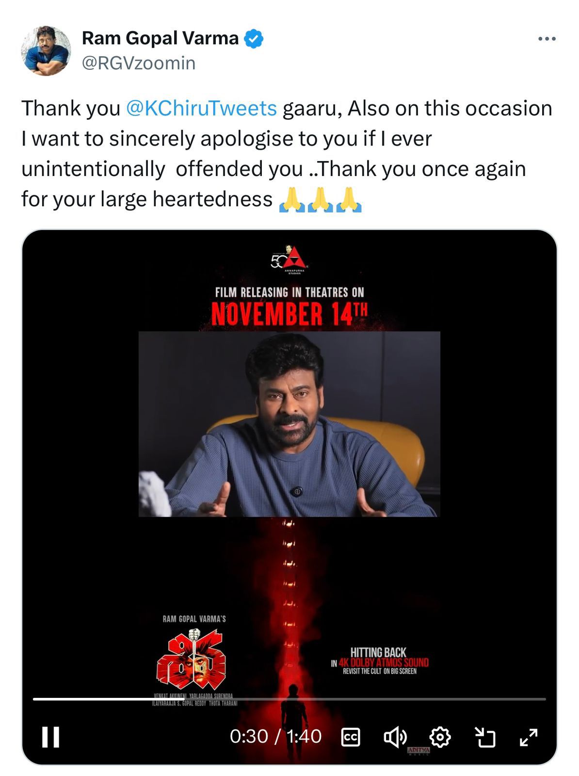 దీనికి స్పందించిన ఆర్జీవీ తన ఎక్స్ (X/Twitter) అకౌంట్లో, “థాంక్స్ చిరంజీవి గారు. అనుకోకుండా మిమ్మల్ని ఇబ్బంది పెట్టి ఉంటే క్షమించండి. విశాల హృదయంతో మా టీమ్ని విష్ చేసినందుకు హృదయపూర్వక కృతజ్ఞతలు”అని ట్వీట్ చేశారు.